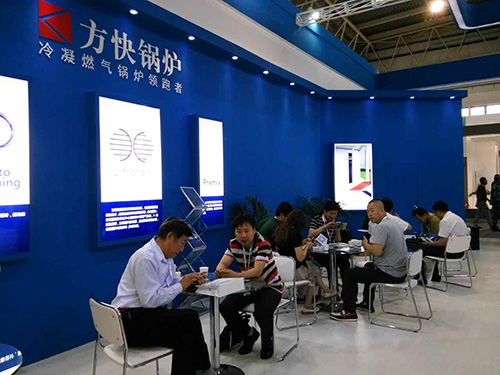 方快锅炉展馆整体设计充满科技超现代感,经典的方快蓝和高雅白相得益彰,让人眼前一亮的2款锅炉新品,使人不由自主步入馆内;精心制作的超炫动画视频更好的诠释了新秀的核心技术与独有内涵,与会人员无不被方快锅炉与生俱来的高贵与气质所吸引。现场人气持续爆棚,洽谈合作接连不断,由内而外的专业与顶级风范使客户源源不断地涌入展台,使方快“新秀”成为展会最耀眼的新星。
